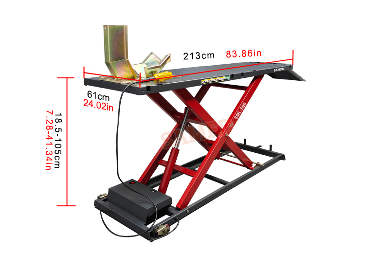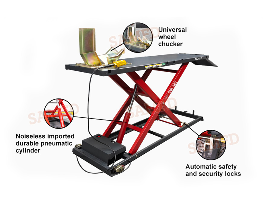 1. Lifting weight 500kg, lifting height 1050mm, suitable for maintenance, repair and tire operation of small and medium displacement motorcycles.