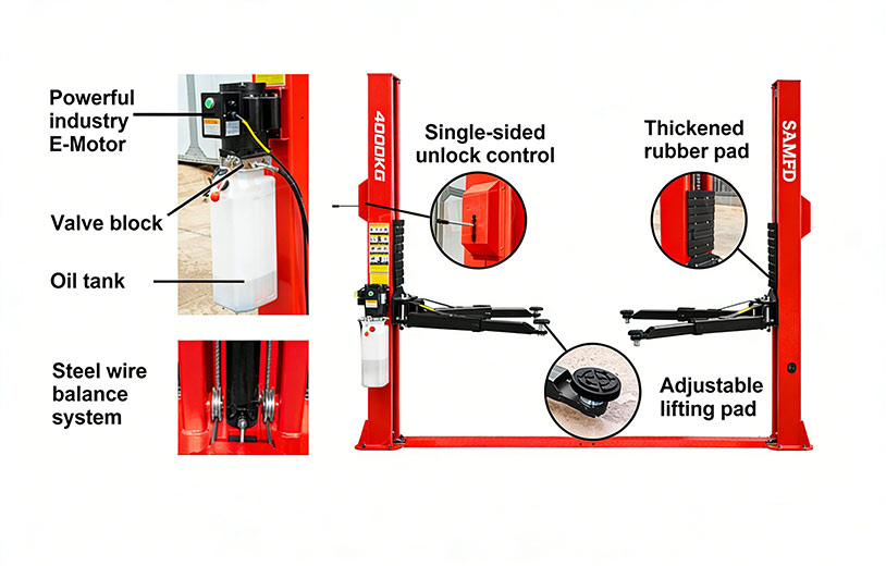 2. Wire rope equalization system forces synchronous movement of two carriages and effectively prevents vehicle form tilting.
