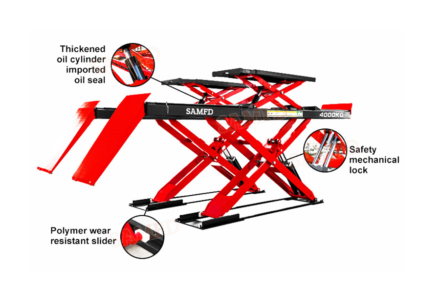 Double tandem synchronous balanced cylinders and four cylinders driving ensures synchronous lifting of platforms,the 4.0T lifting capacity can match various vehicles repair requirement.